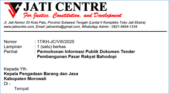 PALU – Perkumpulan Jati Centre telah menyampaikan Surat Permohonan Informasi Publik Dokumen Tender Pembangunan Pasar Rakyat Bahodopi, yang ditujukan pada Kepala Pengadaan Barang dan Jasa Kabupaten Morowali.